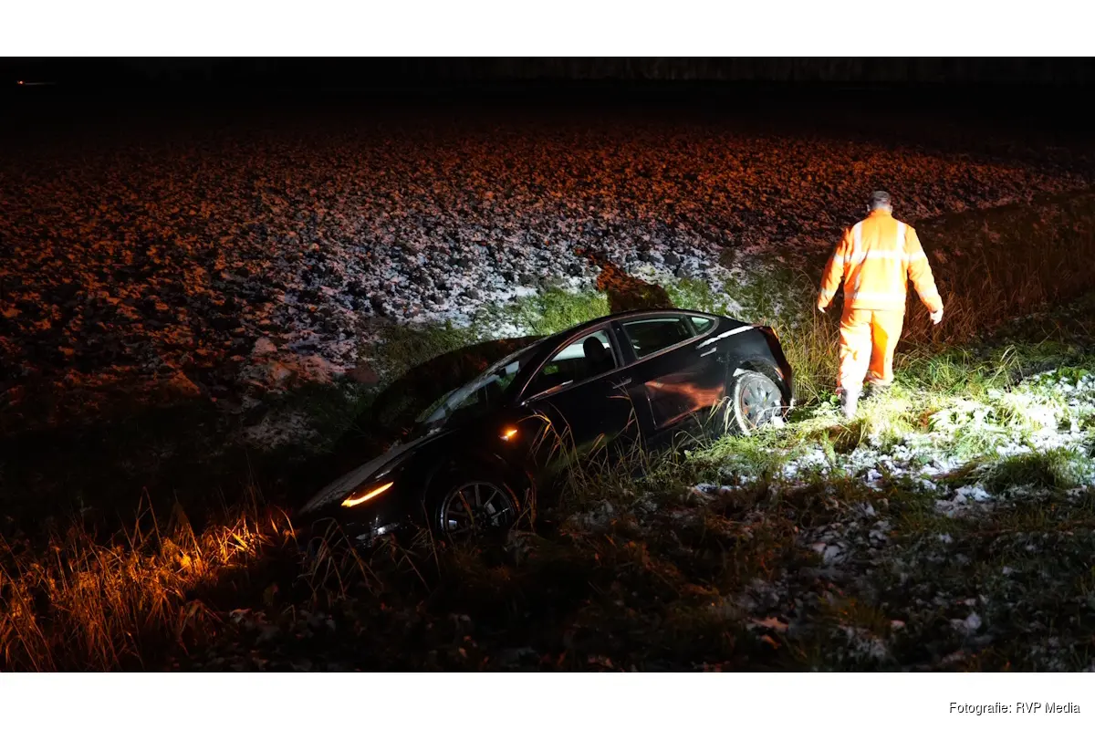 Een bergingsbedrijf heeft de beschadigde auto met behulp van een lier uit de sloot getakeld en afgevoerd.