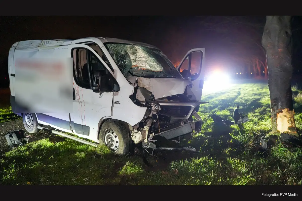 Een bestelbus reed vanuit de richting Den Oever richting Slootdorp toen de bestuurder in de bocht de macht over het stuur verloor en tegen een boom eindigde.