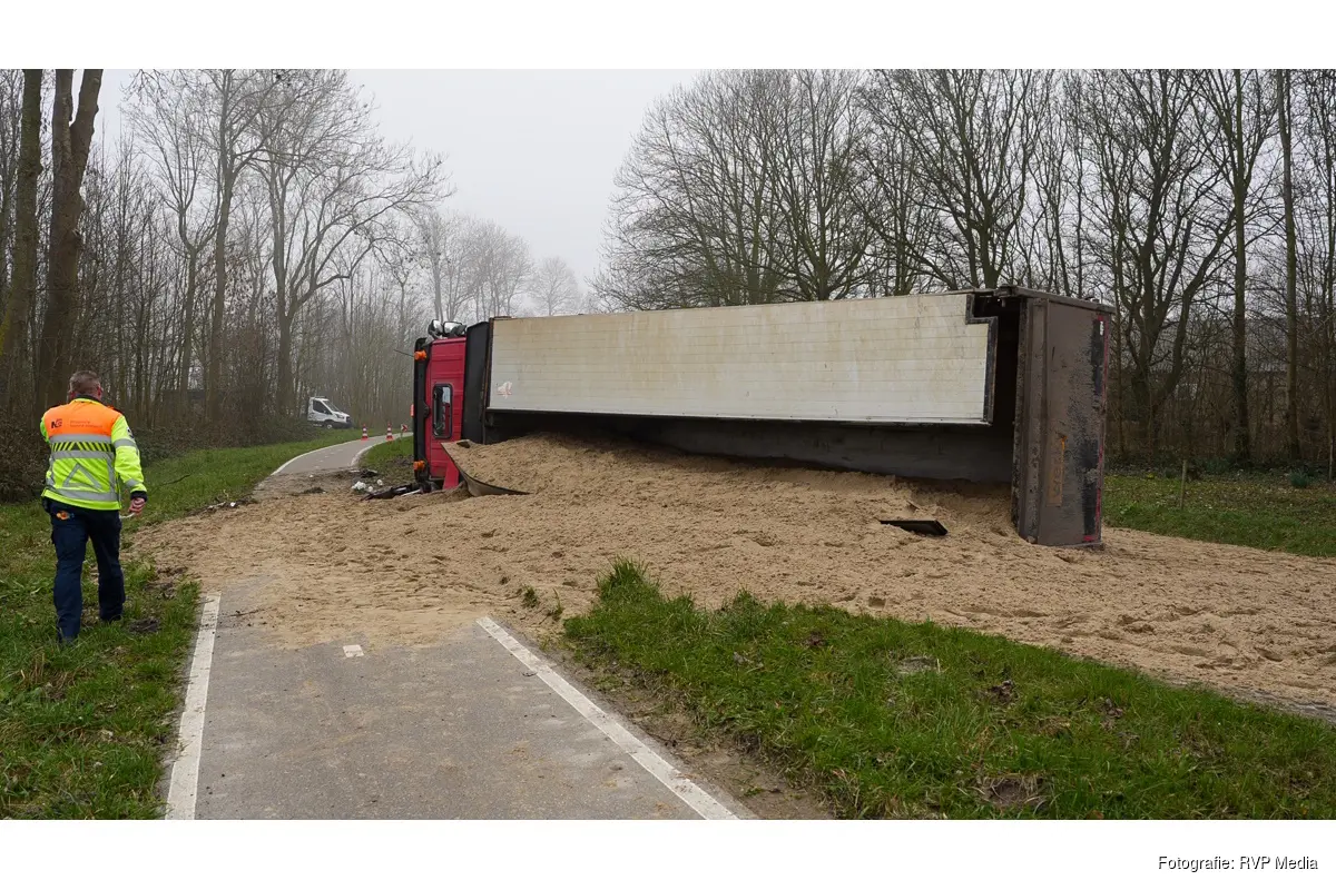 Een bergingsbedrijf zal de vrachtwagen overeind zetten. De weg zal naar verwachting nog enkele uren afgesloten blijven.