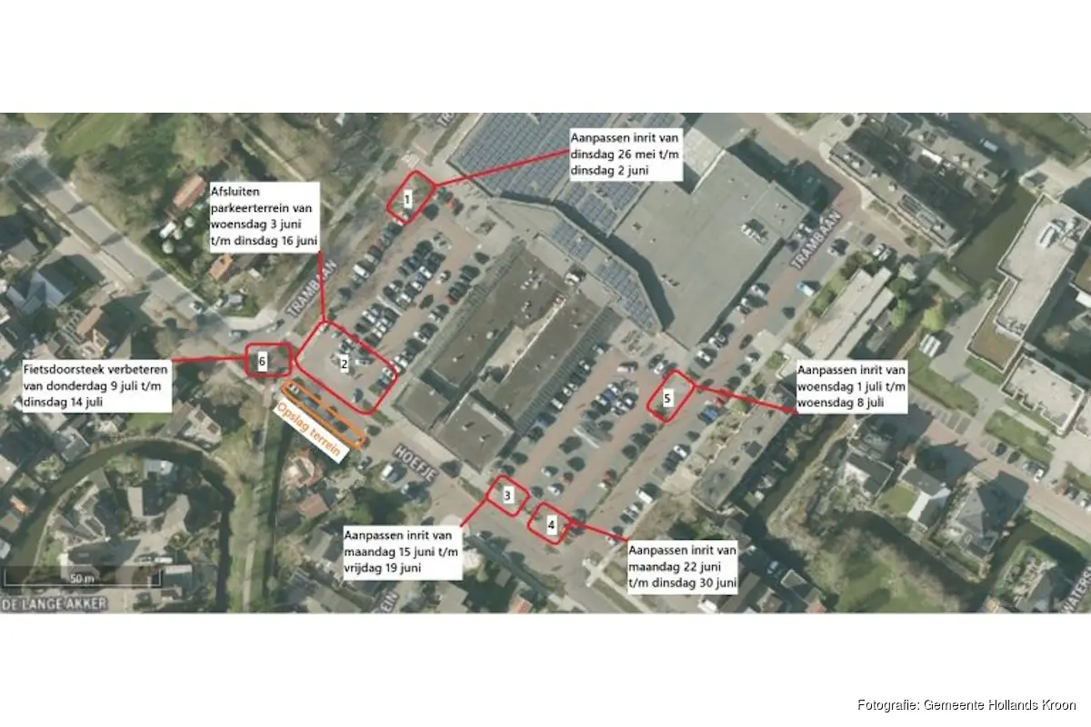 - 1 tot en met 8 juli: aanpassen en verhogen inrit bij de Jumbo aan de kant van de Trambaan (nummer 5);