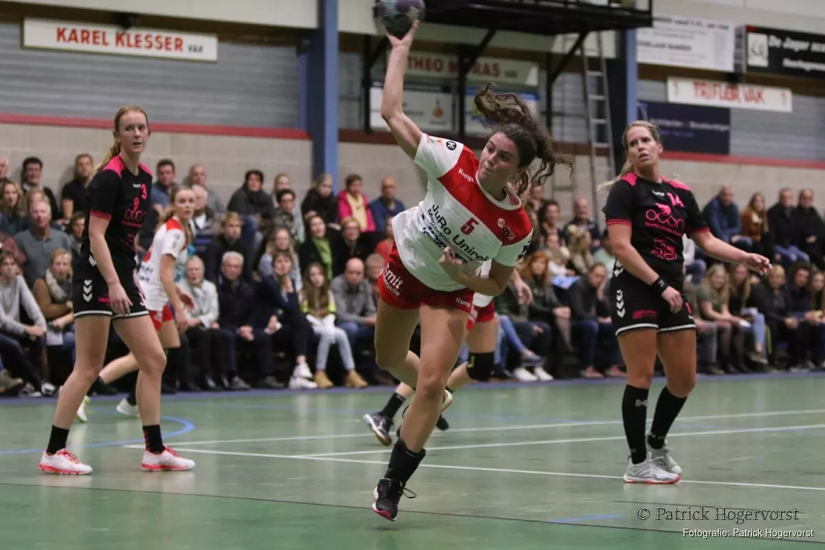 Zou JuRo Unirek/VZV de draad weer op kunnen pakken na het verlies tegen VOC in Amsterdam? Daar was zeker in de beginfase geen sprake van, waar Borhave een 0-3 voorsprong nam alvorens Lisanne Kolken voor VZV tegen scoorde. Hierna trok de thuisploeg de stand weer gelijk door een treffer uit de hoek van Kim Jimmink en een benutte strafworp van Kolken. Na tien minuten kwam VZV voor het eerst op voorsprong door een schitterend doelpunt van Florance Kos. Tot halverwege de eerste helft ging de wedstrijd gelijk op en zette Lisanne Kolken uit een strafworp VZV op een 8-7 voorsprong. Het team van Rolf Schulte nam hierna het heft in handen en scoorde Esma Staal drie treffers op rij 11-8. Met nog vijf minuten te gaan was de voorsprong opgelopen naar 14-8 door twee pegels uit de hoek van Lisa Vlug en weer een schitterende treffer van Florance Kos. Tot het rustsignaal van de prima fluitende scheidsrechters Remmerswaal en Hommen werd er door beide teams om en om gescoord en Djazzmin Trabelsi nam de laatste voor haar rekening waardoor men met 17-11 ging rusten.