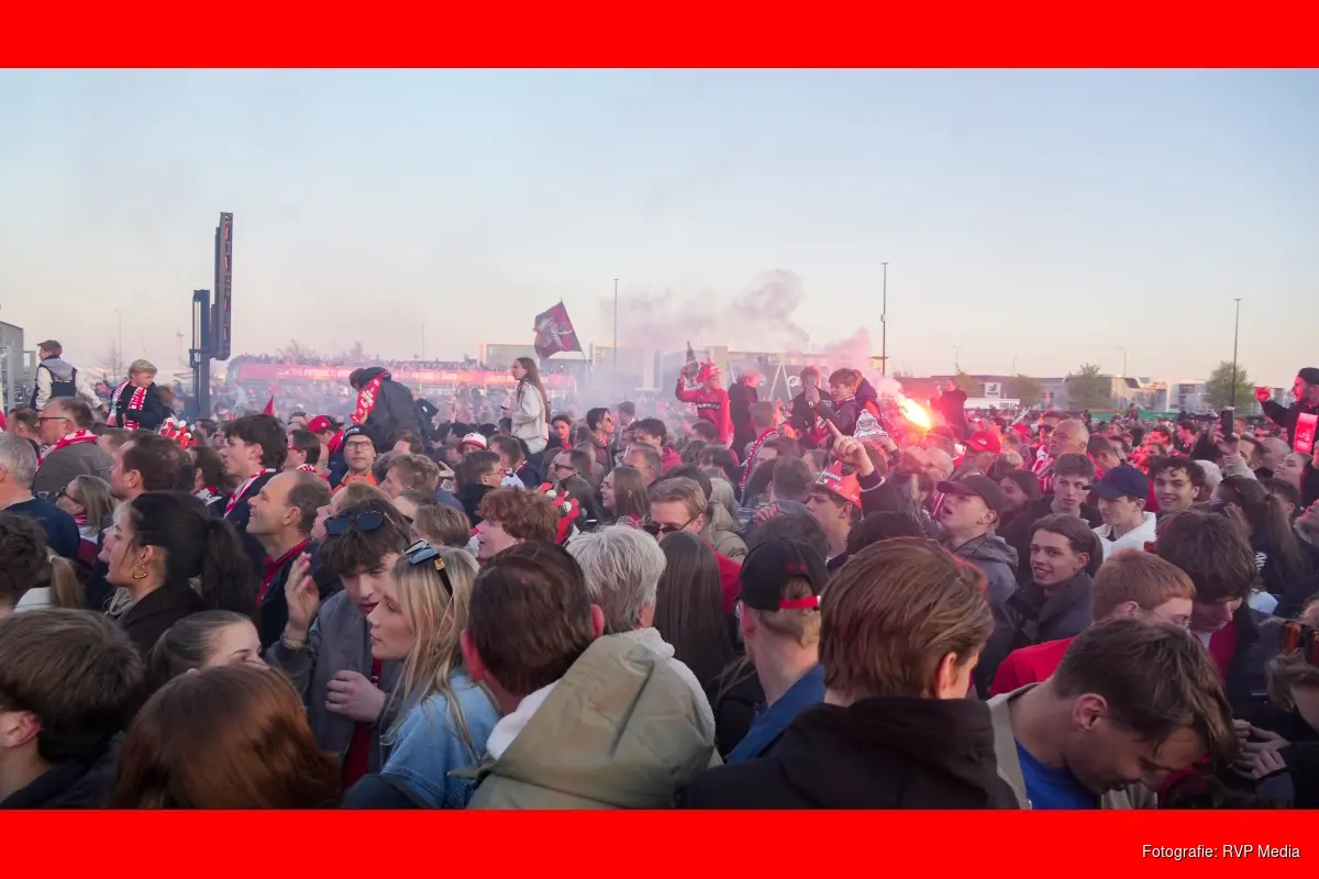 Rond 20.00 uur arriveerde de spelersbus bij de Kooimeerrotonde. Op het naastgelegen parkeerterrein had zich inmiddels een grote menigte verzameld. Daar wachtten supporters vol enthousiasme op het moment waarop de spelers de beker zouden tonen.